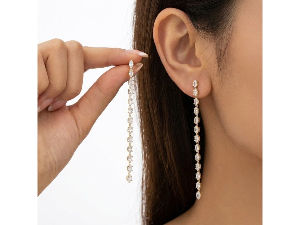 Použitý materiál je navržen tak, aby zajistil dlouhou životnost a pohodlné nošení i během celého večera. Zlatý tón kovu v kombinaci s čirými kameny působí velmi luxusně a snadno se kombinuje s dalšími zlatými šperky nebo vlasovými doplňky. Ať už se chystáte na večírek, oslavu nebo významné rande, tyto náušnice dodají vašemu vzhledu punc exkluzivity a ženskosti.