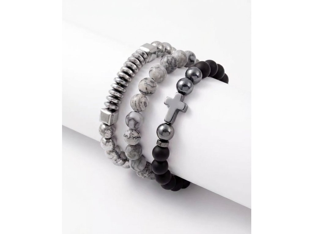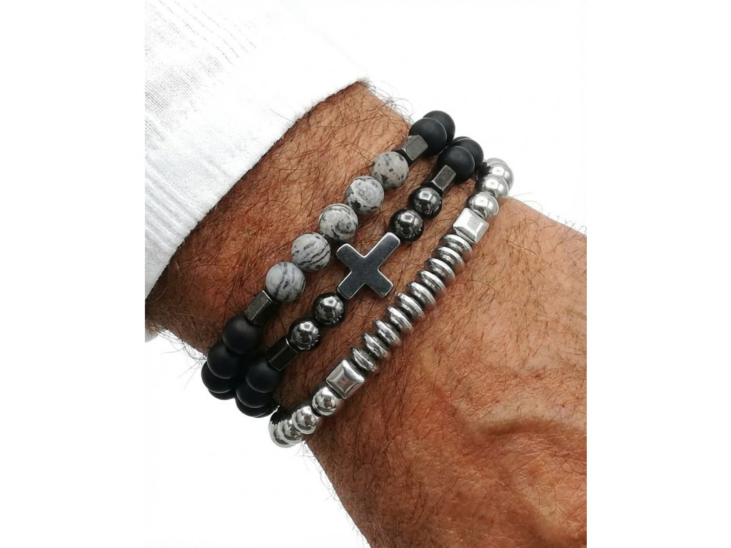 Pánský náramek set 3 ks s křížem – přírodní kameny a ocelové prvky