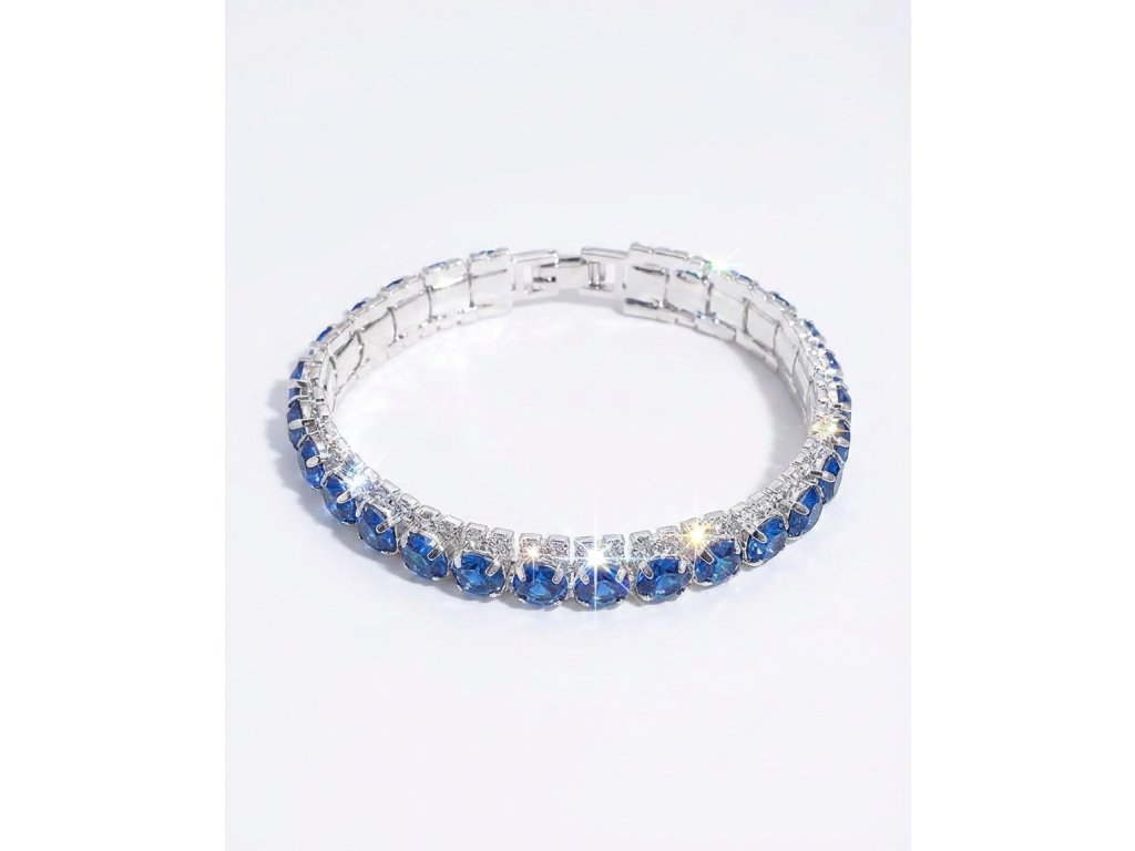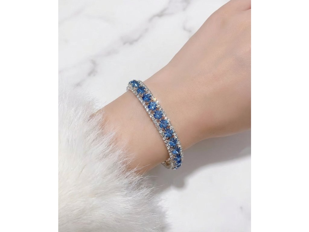 Tento výrazný náramek s krystaly je navržen tak, aby zaujal na první pohled. Pravidelně osazené kulaté kameny v intenzivním modrém odstínu vytvářejí souvislou linii třpytu, která krásně zvýrazní zápěstí při každém pohybu ruky.