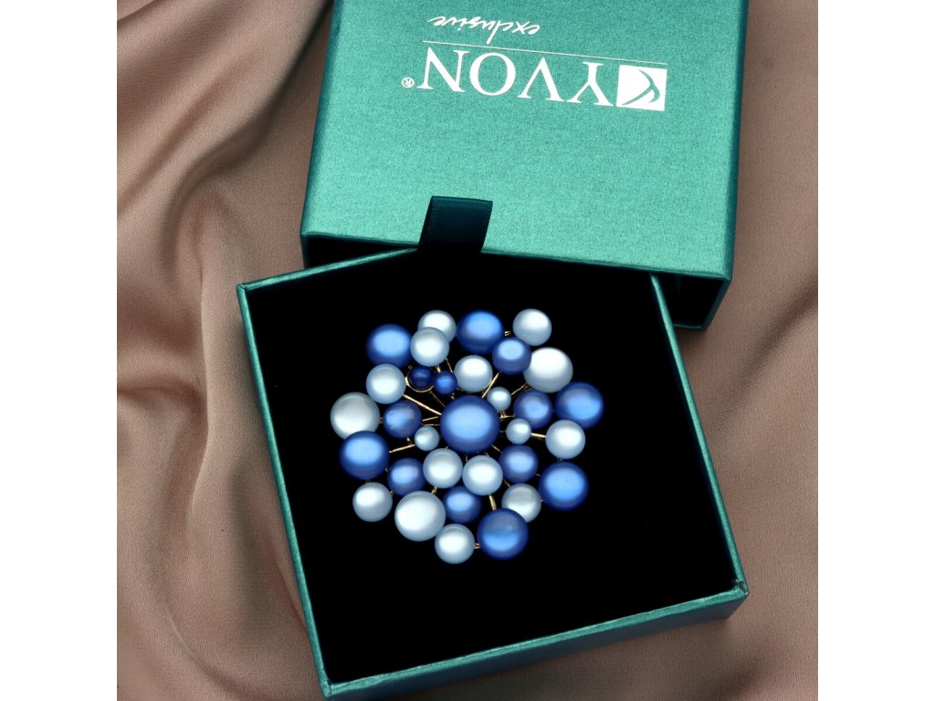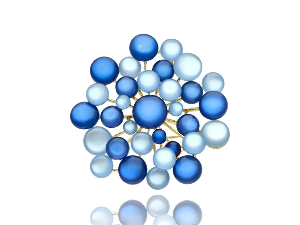 Tato brož působí jako drobná kompozice světla a tvarů. Kulaté prvky v různých velikostech jsou uspořádány do bohatého celku, který připomíná shluk bublin nebo abstraktní květ. Modrá barevná škála od světlejších tónů až po hlubší odstíny vytváří pocit hloubky a pohybu, díky kterému brož okamžitě přitáhne pozornost, ale nepůsobí těžce.
