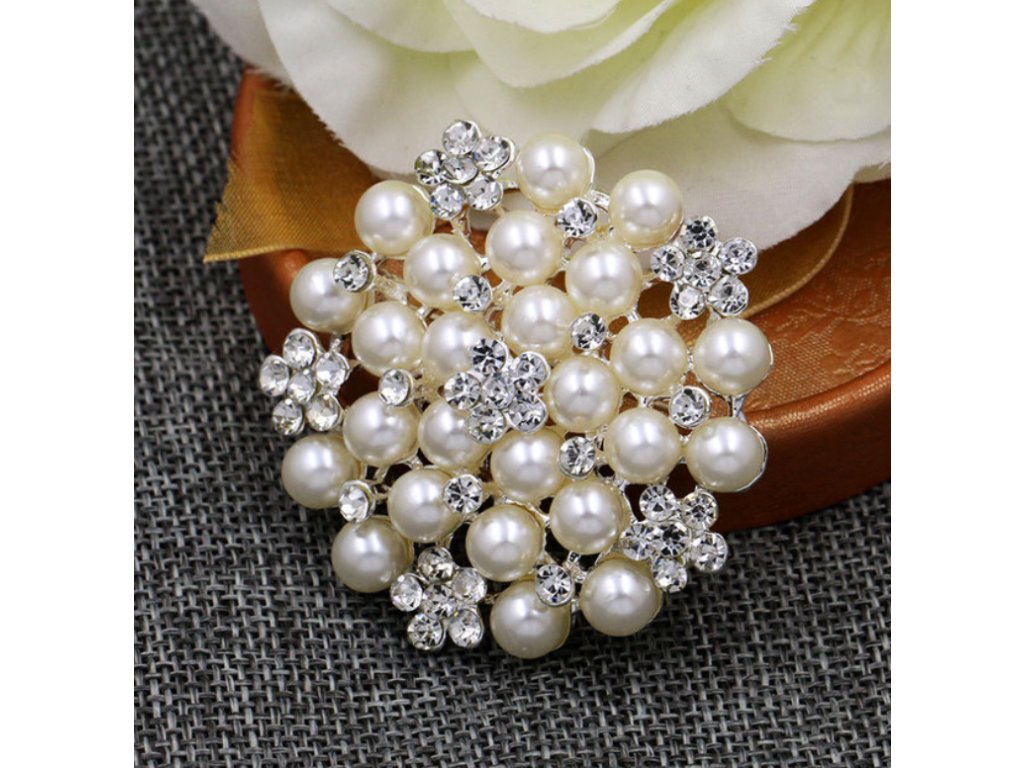 Luxusní brož KVĚT s kamínky a perlami - stříbrná