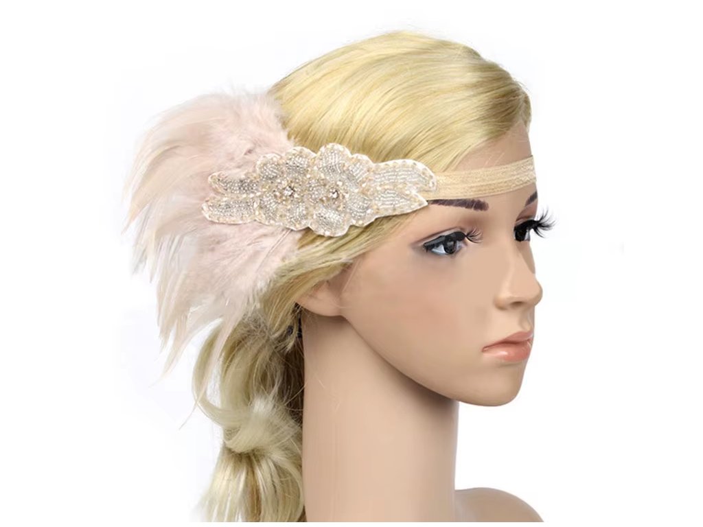 Tato vintage čelenka do vlasů kombinuje jemnost světle růžového peří a třpyt kamínků, které dodávají šperku elegantní a nadčasový vzhled. Čelenka ve smetanové barvě přináší jemnost a univerzálnost, díky níž se skvěle hodí k různým účesům a outfitům.