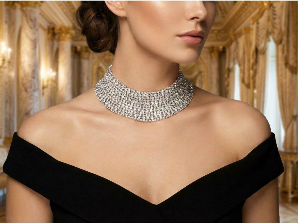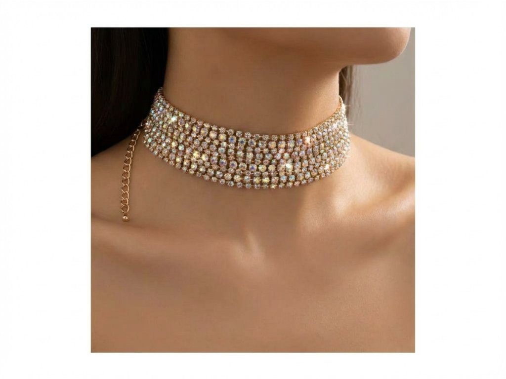 Oslnivý vícevrstvý choker náhrdelník s krystaly vyniká luxusním vzhledem a elegantním třpytem ve dvou barevných variantách.