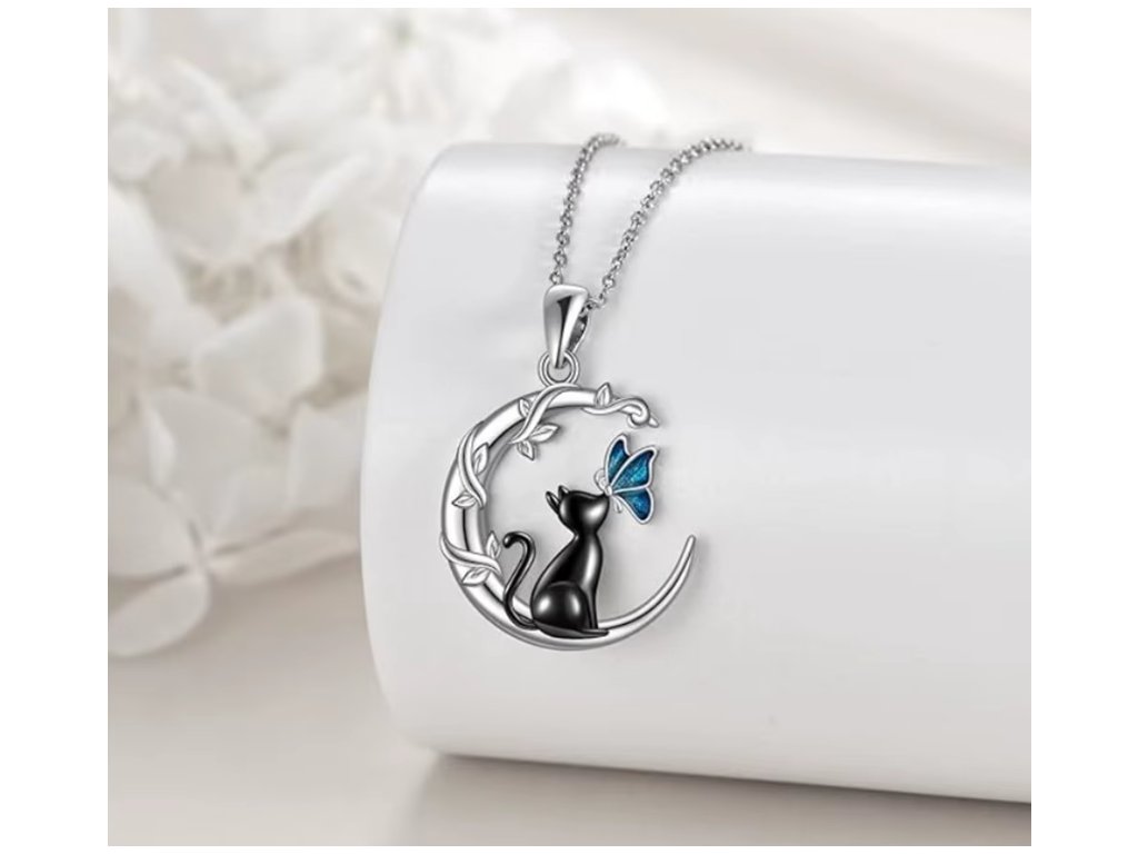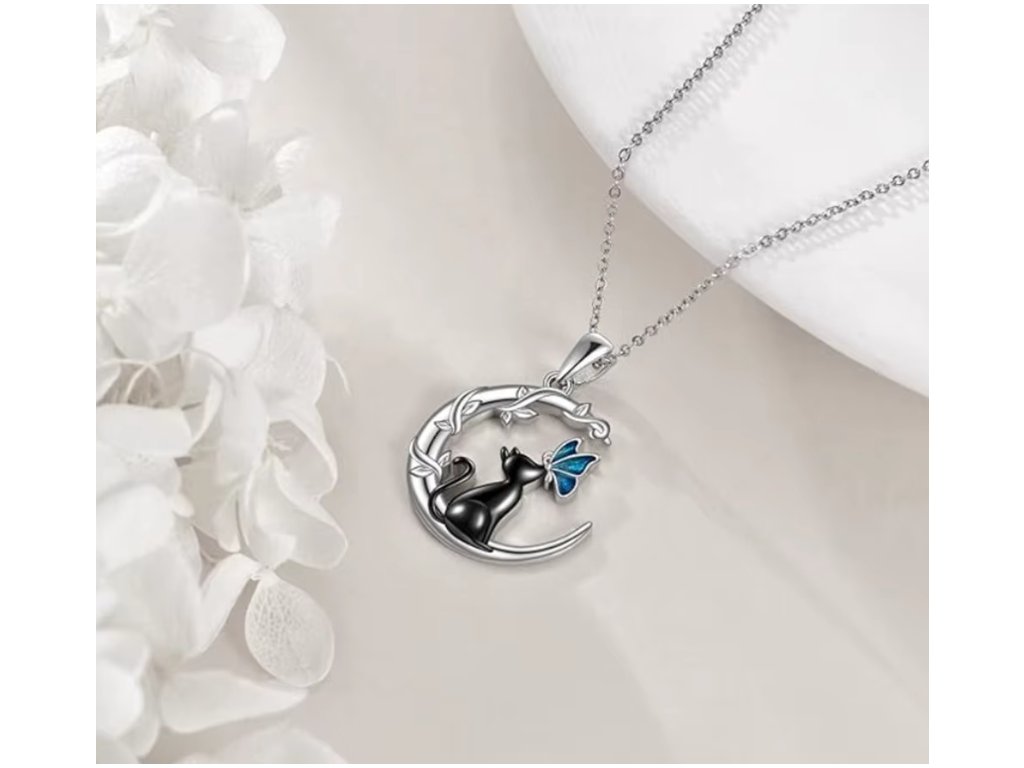 Tento postříbřený náhrdelník zaujme hravým a originálním designem. Přívěsek ve tvaru půlměsíce je doplněn roztomilou černou kočkou, která si hraje s jemným modrým motýlem. Náhrdelník je ideální doplněk pro milovníky koček a osobitý šperk, který podtrhne každý outfit.