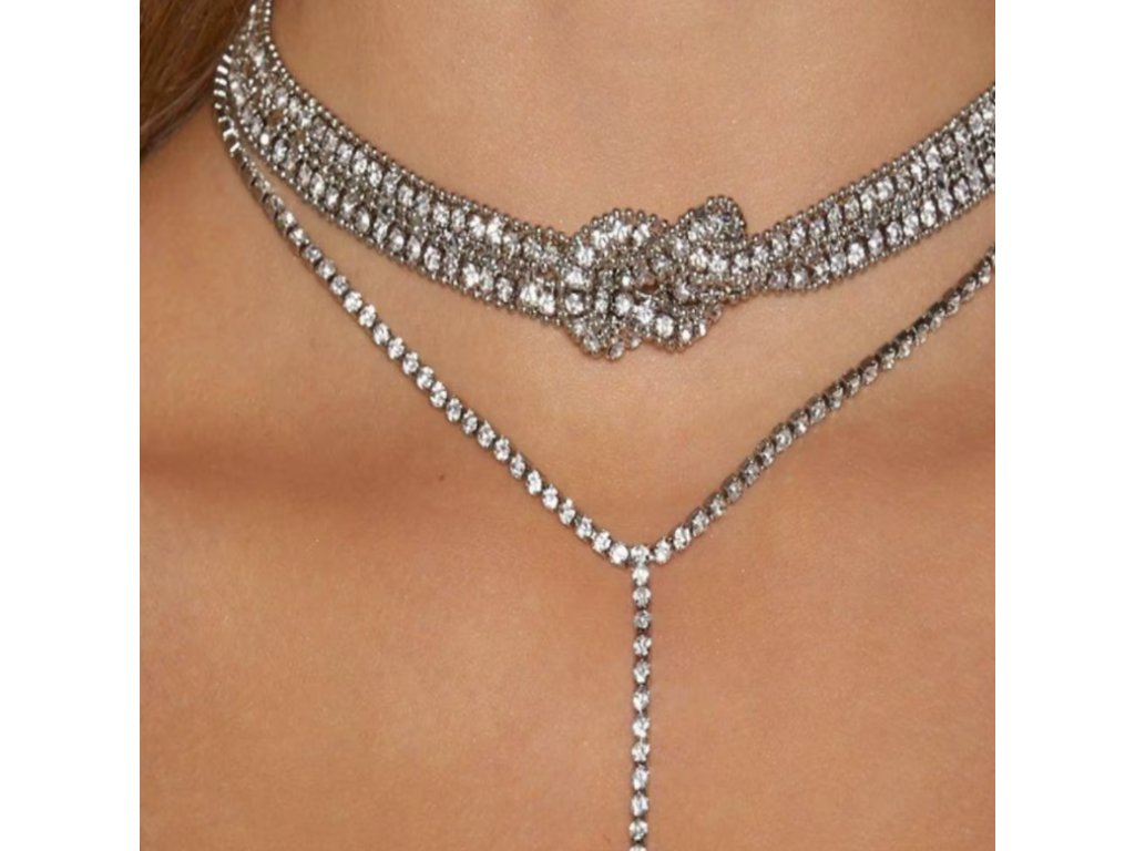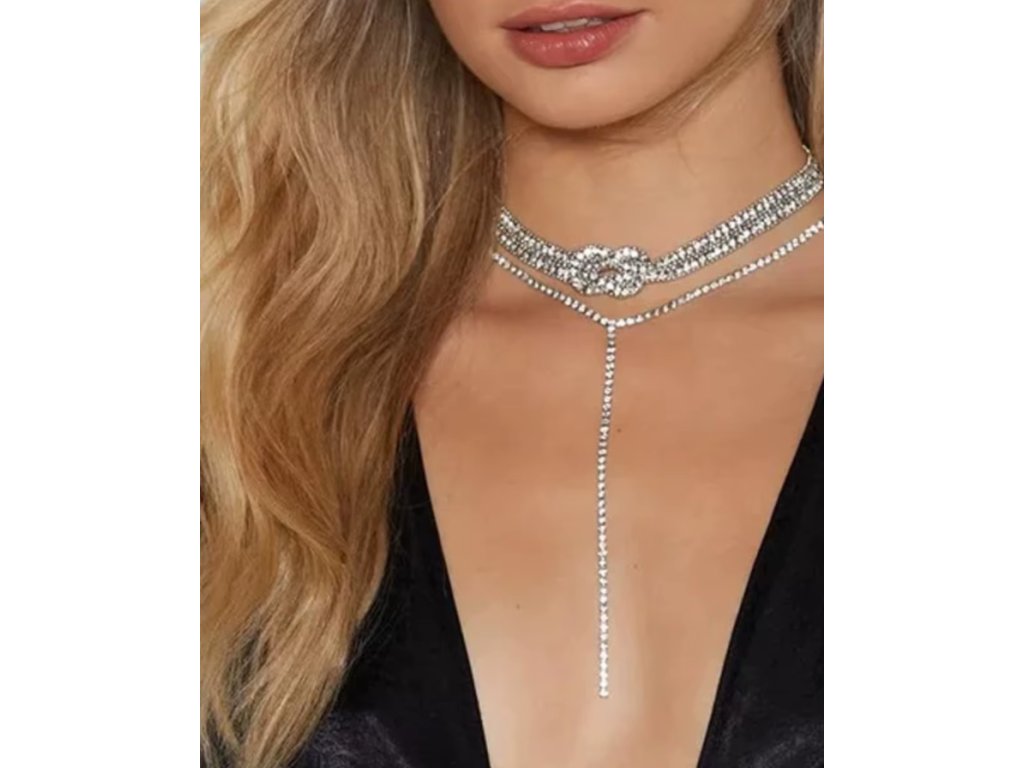 Tento třívrstvý choker náhrdelník zaujme originálním designem a luxusním třpytem. Dvě vrstvy tvořené obdélníkovými krystaly jsou uprostřed elegantně spleteny do dekorativního uzlu, který se stává dominantním prvkem šperku. Spodní třetí vrstva je z drobných krystalů a je zakončena jedním střapcem, jenž dodává náhrdelníku pohyb a výrazný, moderní vzhled.