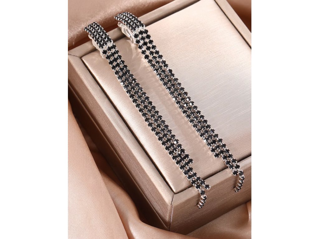 Elegantní dlouhé klipsové náušnice s krystaly – stříbrné, černé krystaly