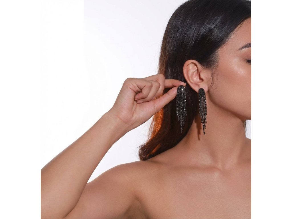 Tyto elegantní černé klipsové náušnice se střapci zaujmou moderním a zároveň nadčasovým designem. Sedm různě dlouhých střapců vytváří zajímavý vrstvený efekt, který dodává náušnicím pohyb a lehkou dramatičnost.