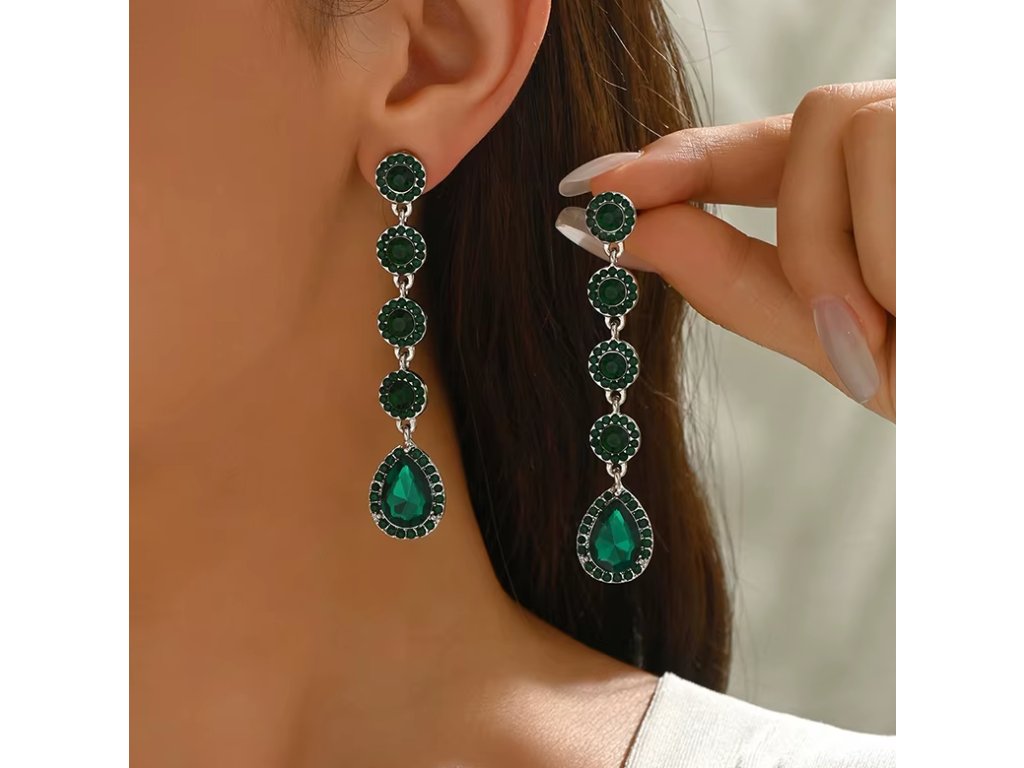Retro dlouhé klipsové náušnice se zelenými kamínky – stříbrné