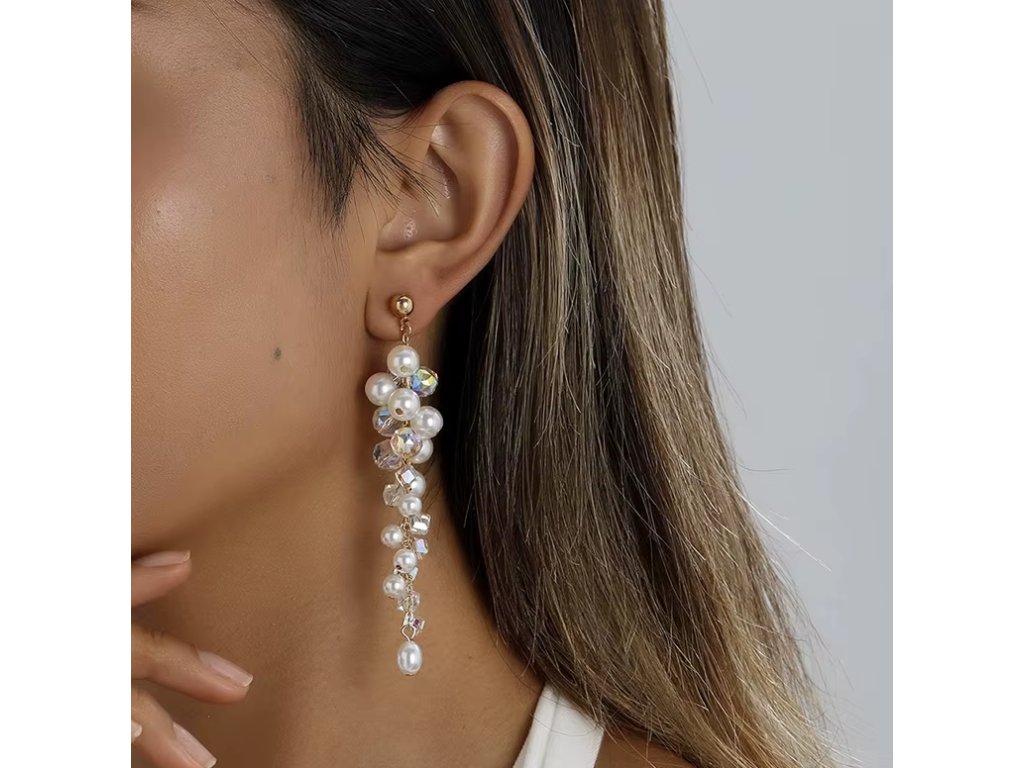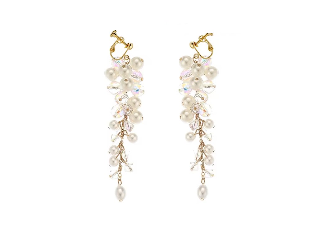 Tyto boho klipsové náušnice zaujmou svým výrazným a elegantním designem. Kombinace dlouhých střapců, bílých umělých perel a lesklých krystalů s AB efektem vytváří originální a sofistikovaný vzhled, který doladí jakýkoliv outfit.