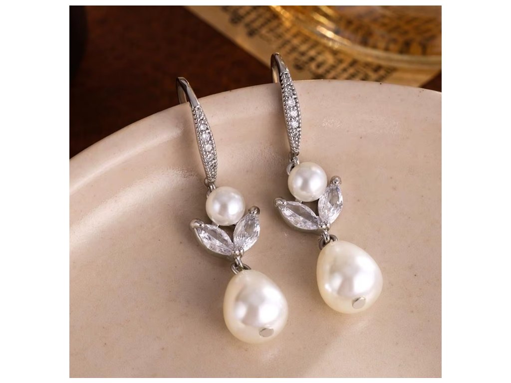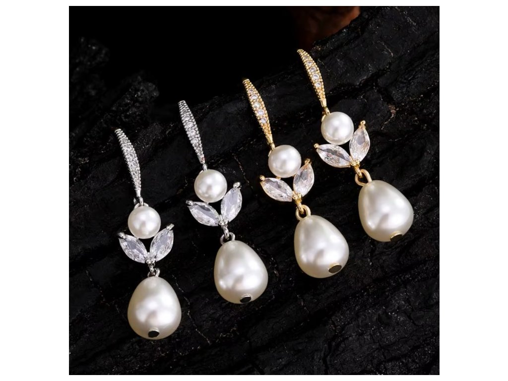Tyto dámské visací náušnice vynikají jemným a elegantním designem. Pod malou perlou jsou umístěny dva třpytivé zirkony ve tvaru lístků, které dodávají šperku lehký a přírodní akcent. Celkový vzhled podtrhuje velká kapkovitá perla zavěšená pod nimi, která náušnicím propůjčuje luxusní a slavnostní charakter.