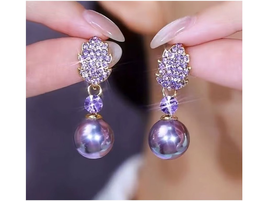 Pozlacené náušnice s fialovými zirkony a perlou