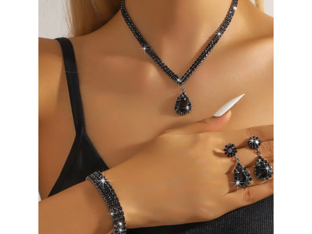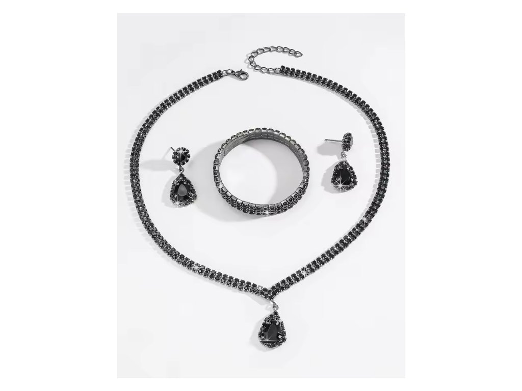 Třídílná souprava s černými krystaly a kapkovitými přívěsky