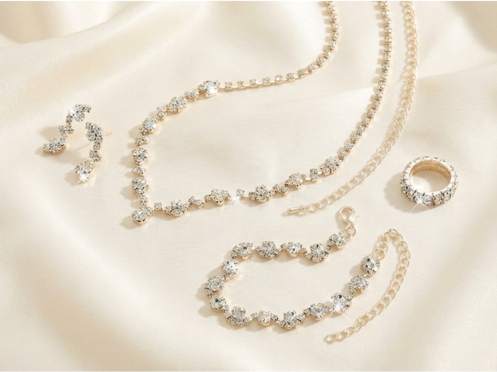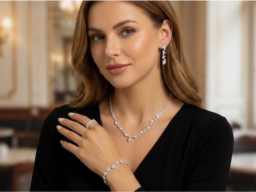 Tato souprava je nepostradatelným doplňkem pro slavnostní příležitosti, jako jsou svatby, večírky nebo plesy. Díky své variabilitě a třpytu se stane vaším nejoblíbenějším kouskem pro chvíle, kdy chcete být středem pozornosti.