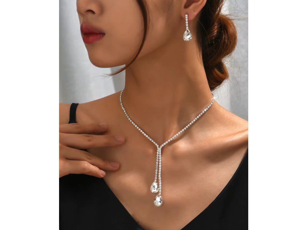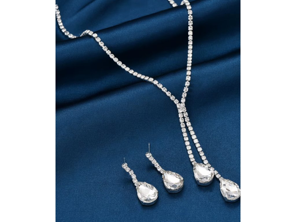 Tato dvoudílná postříbřená souprava zaujme luxusním a slavnostním designem. Puzetové visací náušnice jsou zakončeny třpytivým krystalem ve tvaru kapky, který dodává šperkům jemný pohyb a eleganci. Náhrdelník je doplněn dvěma střapci, na jejichž koncích se nachází rovněž kapkovité krystaly, čímž celek působí harmonicky a výrazně.