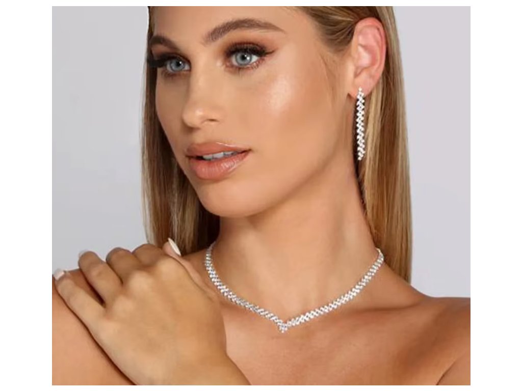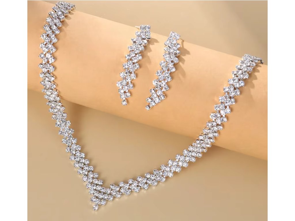 Tato luxusní postříbřená souprava zaujme moderním designem, kde jsou krystaly uspořádány ve čtyřech vrstvách zešikma směrem do elegantní špičky. Náhrdelník působí výrazně, ale zároveň jemně díky preciznímu třpytu krystalů, které krásně odrážejí světlo. Dlouhé puzetové náušnice jsou dokonale sladěné s náhrdelníkem a vytvářejí harmonický celek ideální pro slavnostní příležitosti i elegantní večerní outfity.