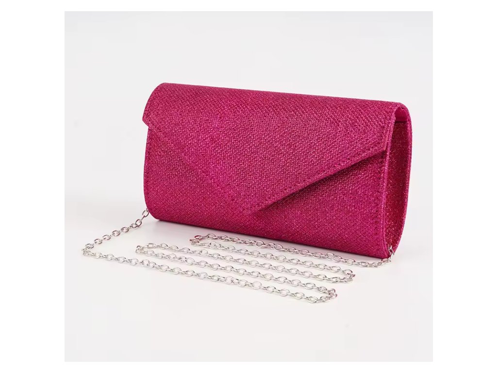Tato dámská kabelka zaujme sytě růžovou barvou a výrazným třpytivým efektem, který dodá outfitu slavnostní nádech. Pevná konstrukce udržuje elegantní tvar a přední zapínací část do špičky podtrhuje moderní design. Stříbrný řetízkový popruh dodává kabelce luxusní vzhled a umožňuje pohodlné nošení přes rameno.