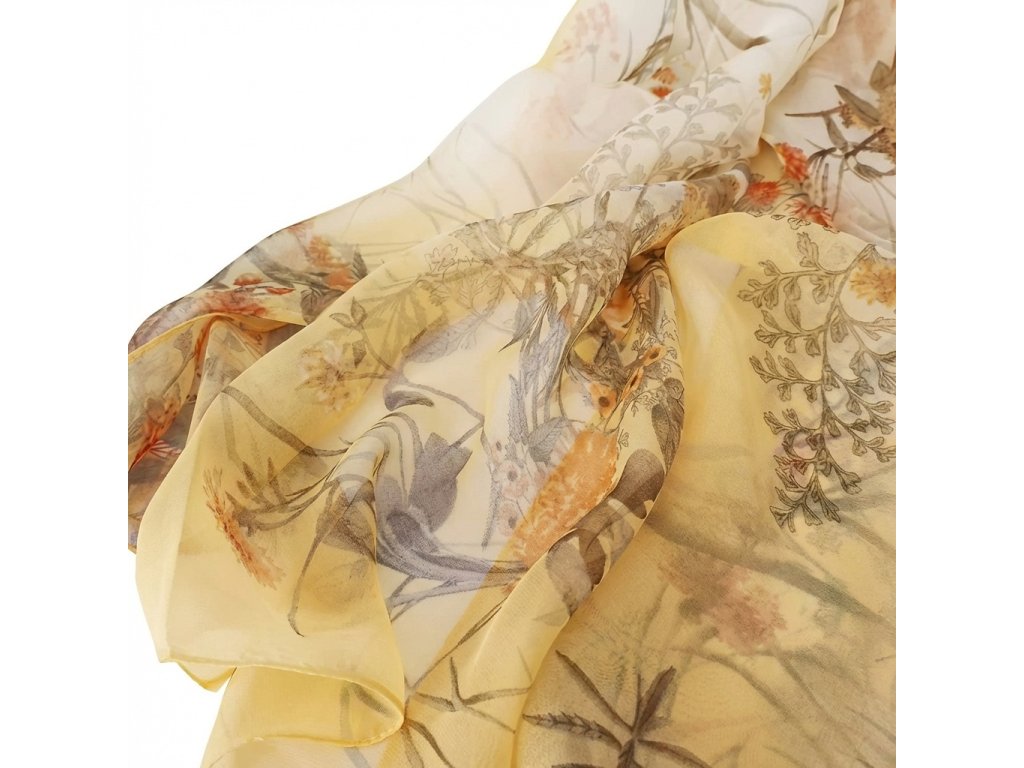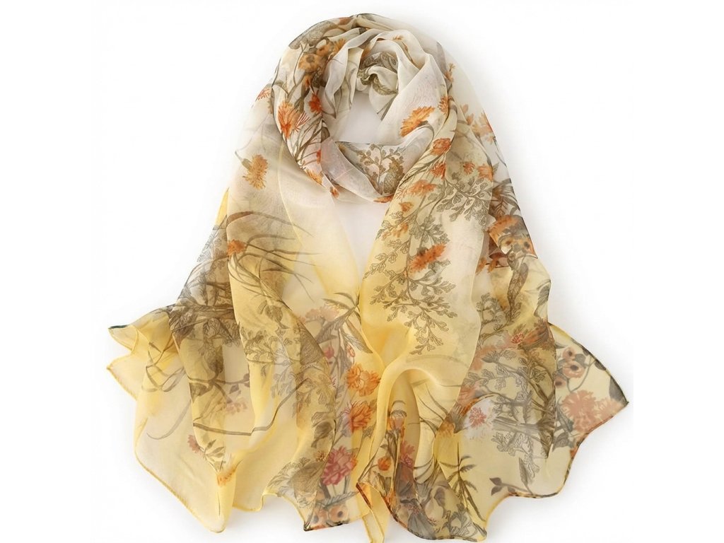 Šátek o délce 160 cm umožňuje mnoho způsobů uvázání. Můžete jej nosit jako klasický přehoz přes ramena, uvázat si ho kolem krku k saku nebo jej využít jako dekorativní prvek ke společenským šatům. Žlutý podklad s potiskem „Zelená tráva“ dodá vašemu vzhledu svěží a upravený dojem bez ohledu na aktuální sezónu.