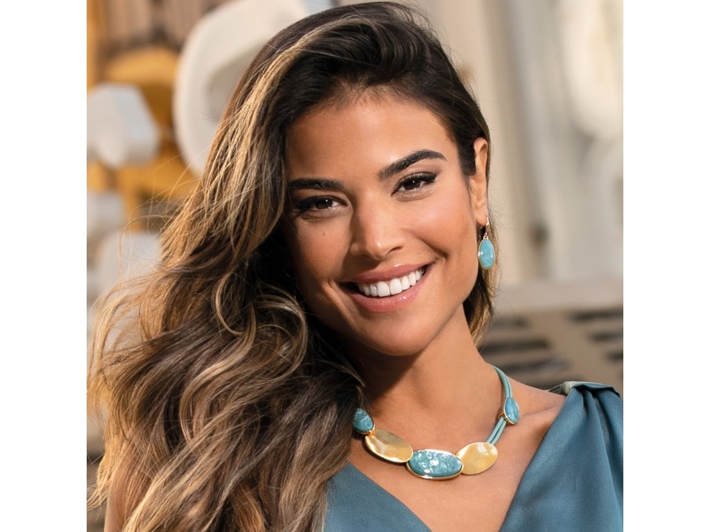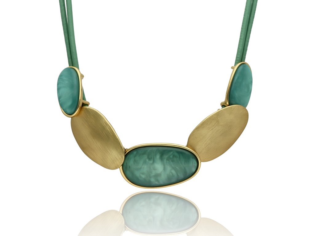 Vyvážená kombinace tvarů, barev a klidné elegance dává tomuto náhrdelníku osobitý charakter, který nepůsobí okázale, ale přirozeně přitahuje pozornost. Oválné prvky s jemnou kresbou vytvářejí harmonický rytmus, zatímco zelený tón dodává šperku svěžest a lehkost. Náhrdelník krásně sedí v dekoltu a stává se přirozeným středem celé stylizace.