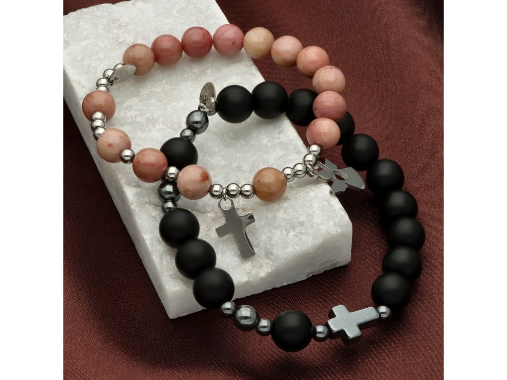 Set náramků z achátu a rodochrozitu vznikl jako symbol propojení dvou duší. Spojuje v sobě sílu a klid, mužský a ženský prvek, duchovní význam i estetickou krásu. Černý matný achát u pánského náramku působí pevně a ochranně, zatímco jemný růžový rodochrozit u dámského dodává setu něhu a hloubku.