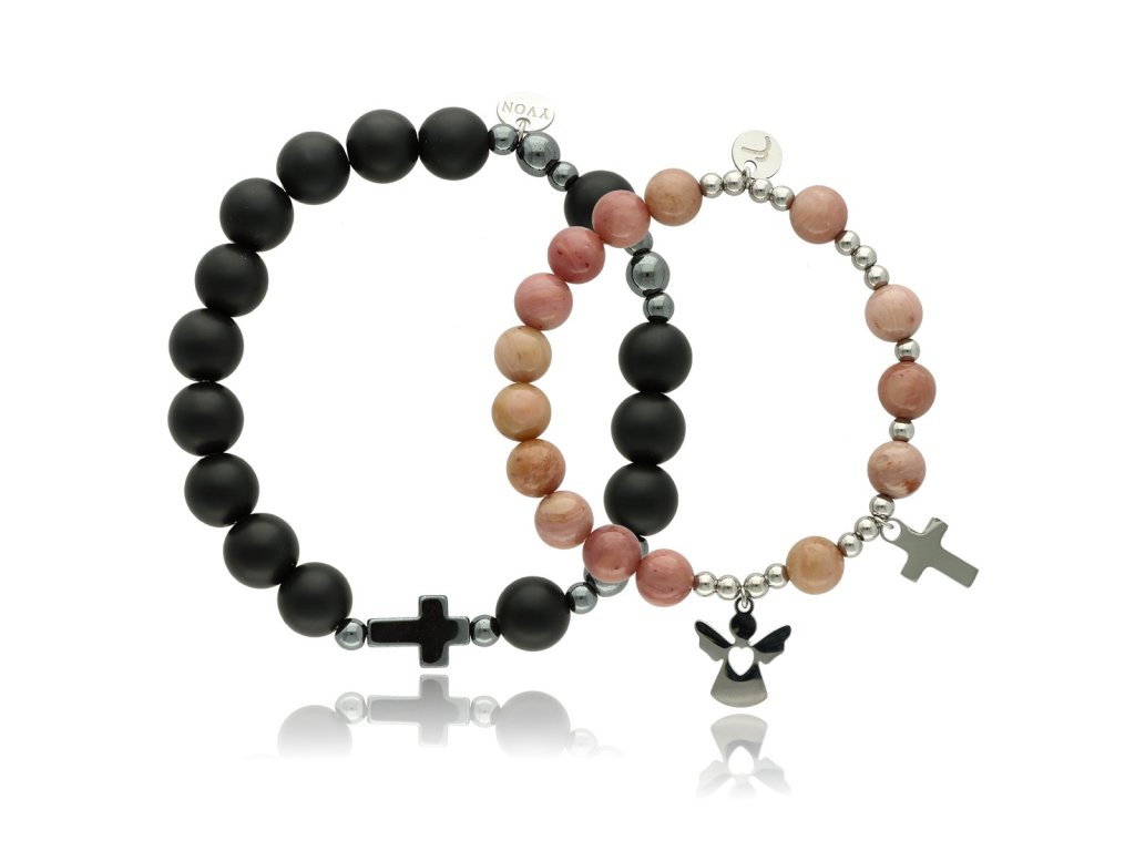 Oba náramky jsou vyrobeny z přírodních kamenů a chirurgické oceli 316L, což zaručuje nejen krásu, ale i odolnost a komfort při nošení. Zlaté a ocelové prvky jsou upraveny metodou PVD, díky níž zůstávají dlouhodobě lesklé. Pánský růženec obsahuje korálky o průměru 10 mm, dámský 8 mm. Symbolika anděla a křížku dodává šperkům hlubší význam. Celý set je dodáván v elegantní dárkové krabičce – ideální jako dárek pro výjimečný pár.