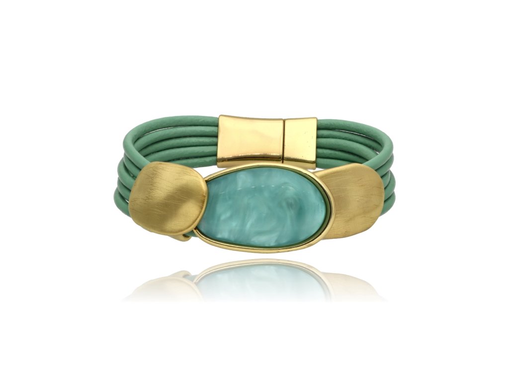 Náramek je vyroben z přírodní kůže, barevné pryskyřice a hypoalergenního kovu (zamak). Magnetické zapínání usnadňuje nasazení a drží bezpečně po celý den. Díky vrstvenému koženému provedení se náramek pohodlně přizpůsobí zápěstí a příjemně se nosí. Ve spojení s náhrdelníkem a náušnicemi ze stejné série vytváří ucelený a vizuálně sladěný celek.