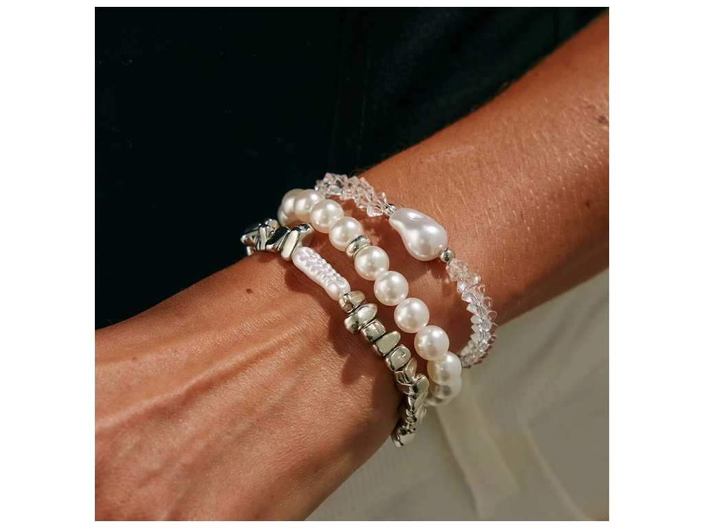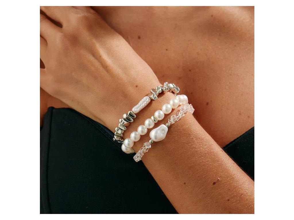 Tato sada tří náramků zaujme harmonickou kombinací perel různých velikostí, které dodávají šperkům jemný a nadčasový vzhled. Stříbrné a čiré korálky náramky krásně doplňují a přidávají jim lehký třpyt. Náramky lze nosit společně pro výraznější efekt nebo samostatně jako decentní doplněk ke každodennímu i slavnostnímu outfitu.