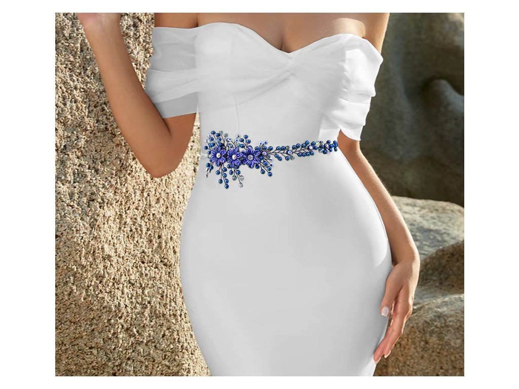 Tento ozdobný pás na šaty v modré barvě je tvořen třemi výraznými modrými květy, které mu dodávají romantický a elegantní charakter. Jemné modré perly a třpytivé krystaly krásně odrážejí světlo a zvýrazňují celkový design. Pás je ideální volbou pro společenské šaty, plesy, svatby i slavnostní příležitosti, kde chcete vyniknout decentním detailem.