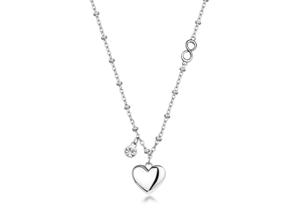 Dominantním prvkem je elegantní přívěsek ve tvaru srdce, jenž symbolizuje lásku, cit a harmonii. Šperk je dále ozdoben čirým krystalem, který mu dodává jemný třpyt, a symbolem nekonečna, představujícím věčnost, rovnováhu a hluboké pouto. Tyto prvky společně vytvářejí sofistikovaný a velmi ženský design.