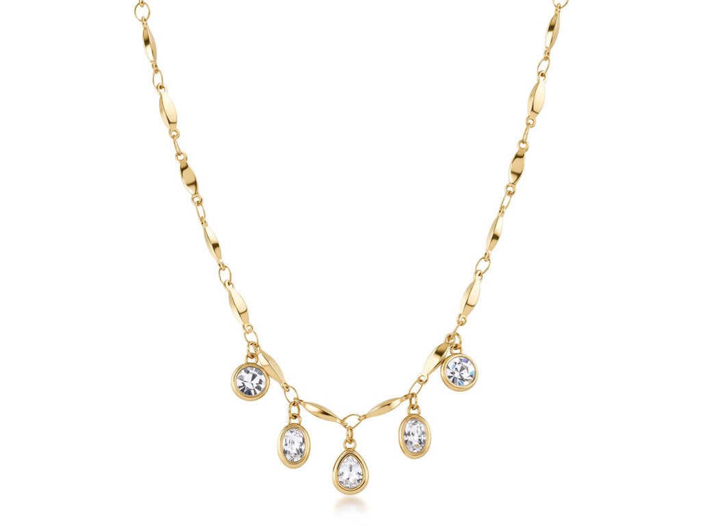 Náhrdelník zdobí jemné přívěsky s motivem kapky a oválů, osazené precizně broušenými čirými krystaly. Ty vytvářejí nádherný třpyt a dodávají šperku sofistikovaný, ženský charakter. Celkový design je harmonický, lehký a elegantní, takže se skvěle hodí jak k dennímu outfitu, tak i ke společenským šatům.
