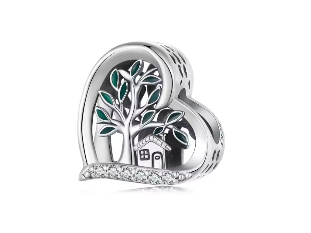 Tento jemný stříbrný korálek ve tvaru srdce zaujme kombinací třpytivých zirkonů na polovině obvodu a detailně vypracovaným motivem uvnitř – domeček s korunou stromu. Design vytváří dojem útulného domova a harmonie, což dodává šperku osobitý charakter. Korálek je ideální pro náramky nebo řetízky, které chcete obohatit originálním a sentimentálním detailem.