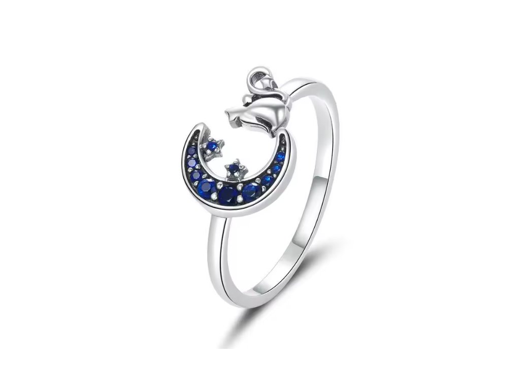 Tento jedinečný otevřený prsten ze stříbra 925 spojuje hravý a poetický motiv kočky a nočního měsíce. Na jednom konci prstenu se nachází měsíc osazený tmavě modrými zirkony, které dodávají šperku tajemný třpyt, na druhém konci je detailně zpracovaná sedící kočka. Prsten působí jemně, romanticky a je ideální volbou pro milovníky koček a originálních šperků s příběhem.