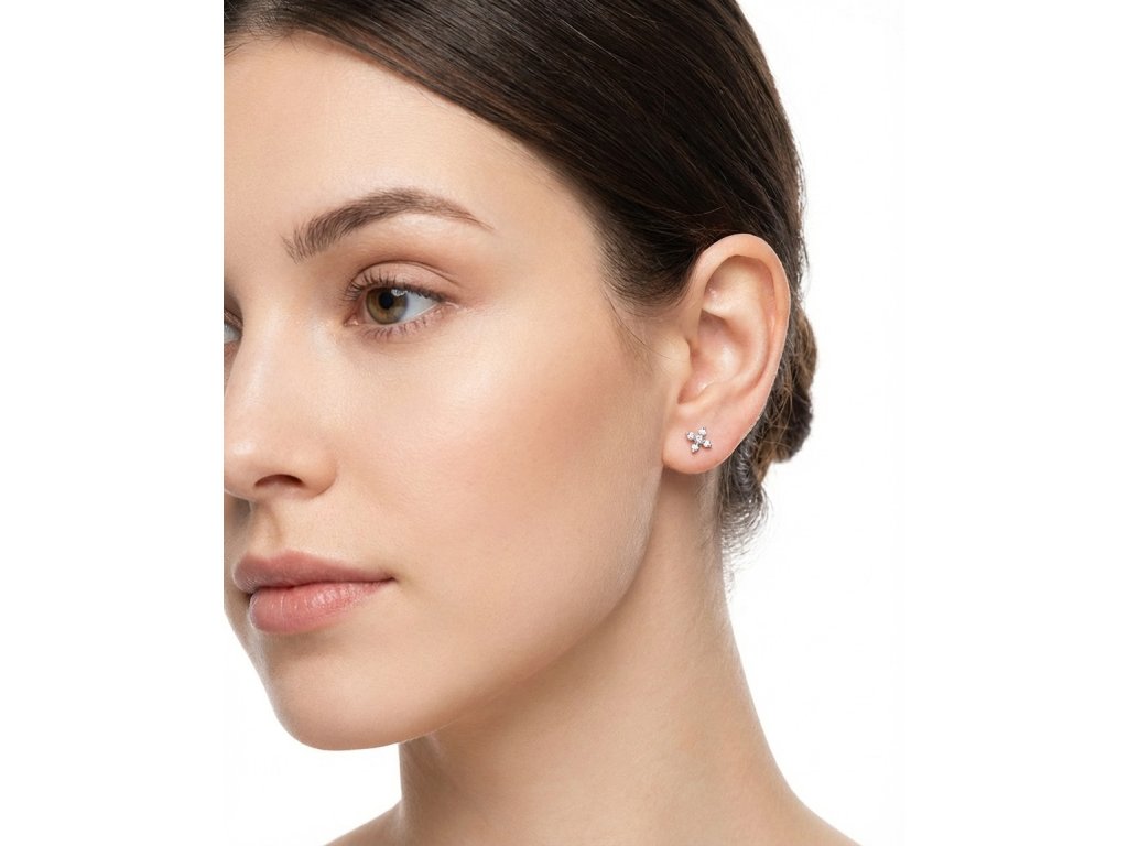 Tyto elegantní náušnice ve tvaru kříže spojují symbolický motiv s jemným luxusním třpytem. Každé rameno je osazeno drobnými kameny, které vytvářejí čistý, světelný efekt bez přehnané okázalosti. Minimalistický design umožňuje snadné kombinování s dalšími šperky.