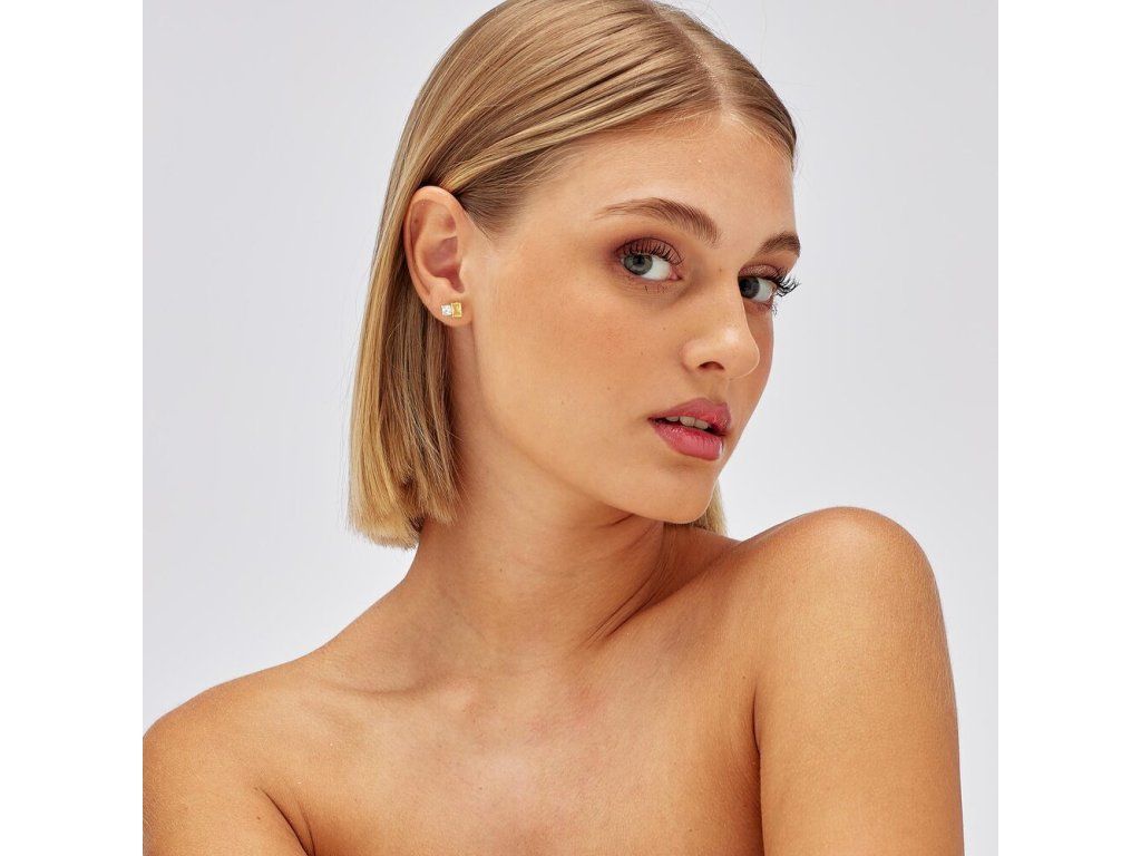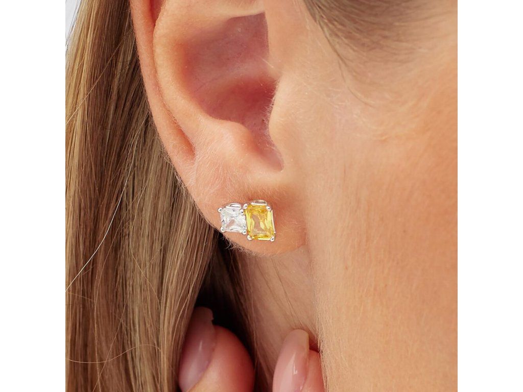 Dominantou šperku je dvojice precizně broušených kubických zirkonů – horní čirý zirkon dodává náušnici elegantní třpyt, zatímco spodní žlutý zirkon přináší svěží barevný akcent plný energie a optimismu. Moderní geometrické usazení kamenů vytváří stylový a minimalistický vzhled.