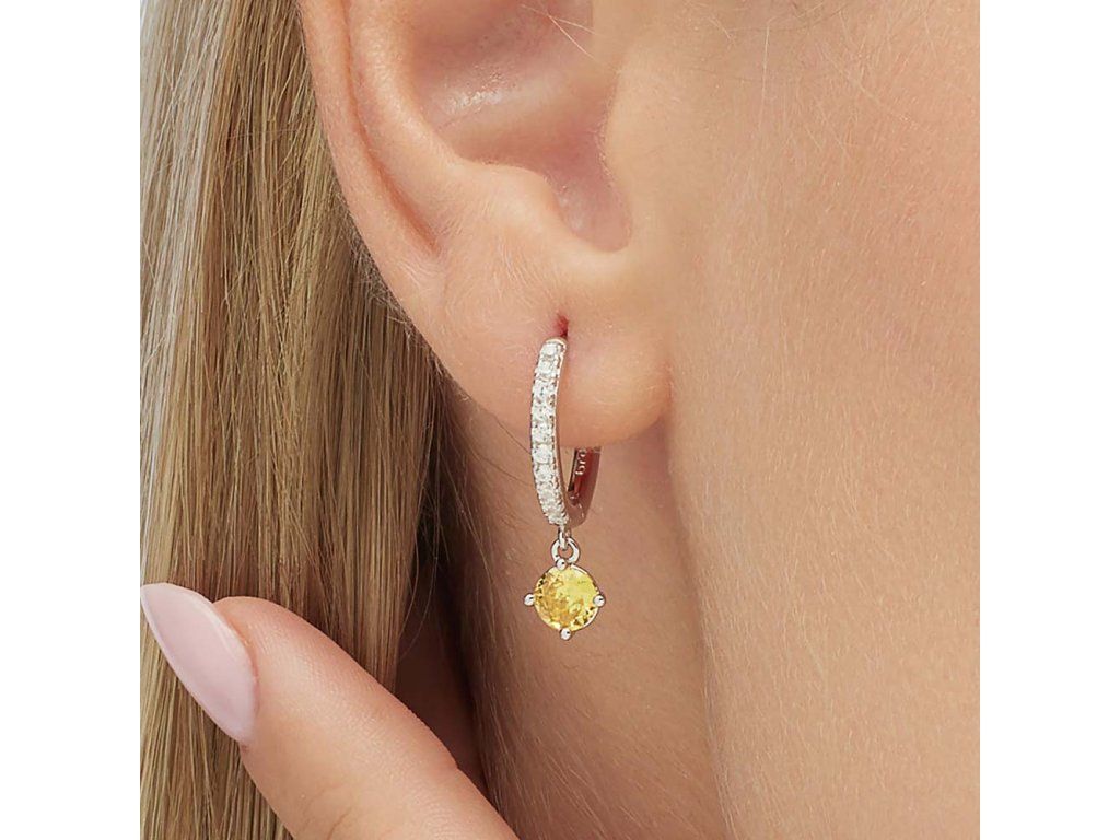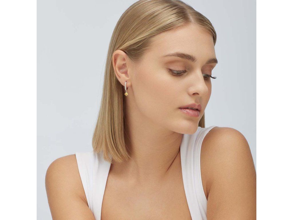 Dominantním prvkem je žlutý kubický zirkon, který přináší svěží barevný akcent symbolizující energii, optimismus a radost. Tento kámen je doplněn jemnými čirými zirkony na kruhové části náušnice, které dodávají šperku luxusní třpyt a elegantní vzhled.